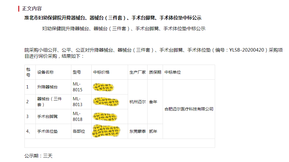 淮北市婦幼保健院手術體位墊中標后進院清單