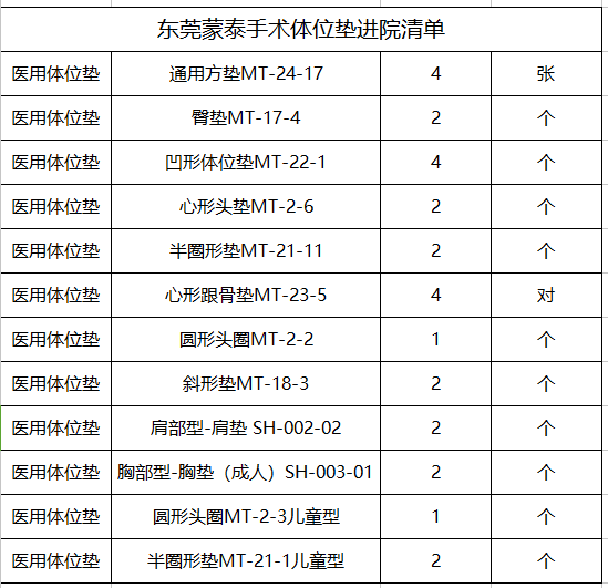 中標后,由于疫情的影響,手術體位墊的款式遲遲沒有確定下來,一直到11月份,終于確定了部份款式先進院使用,清單如下: